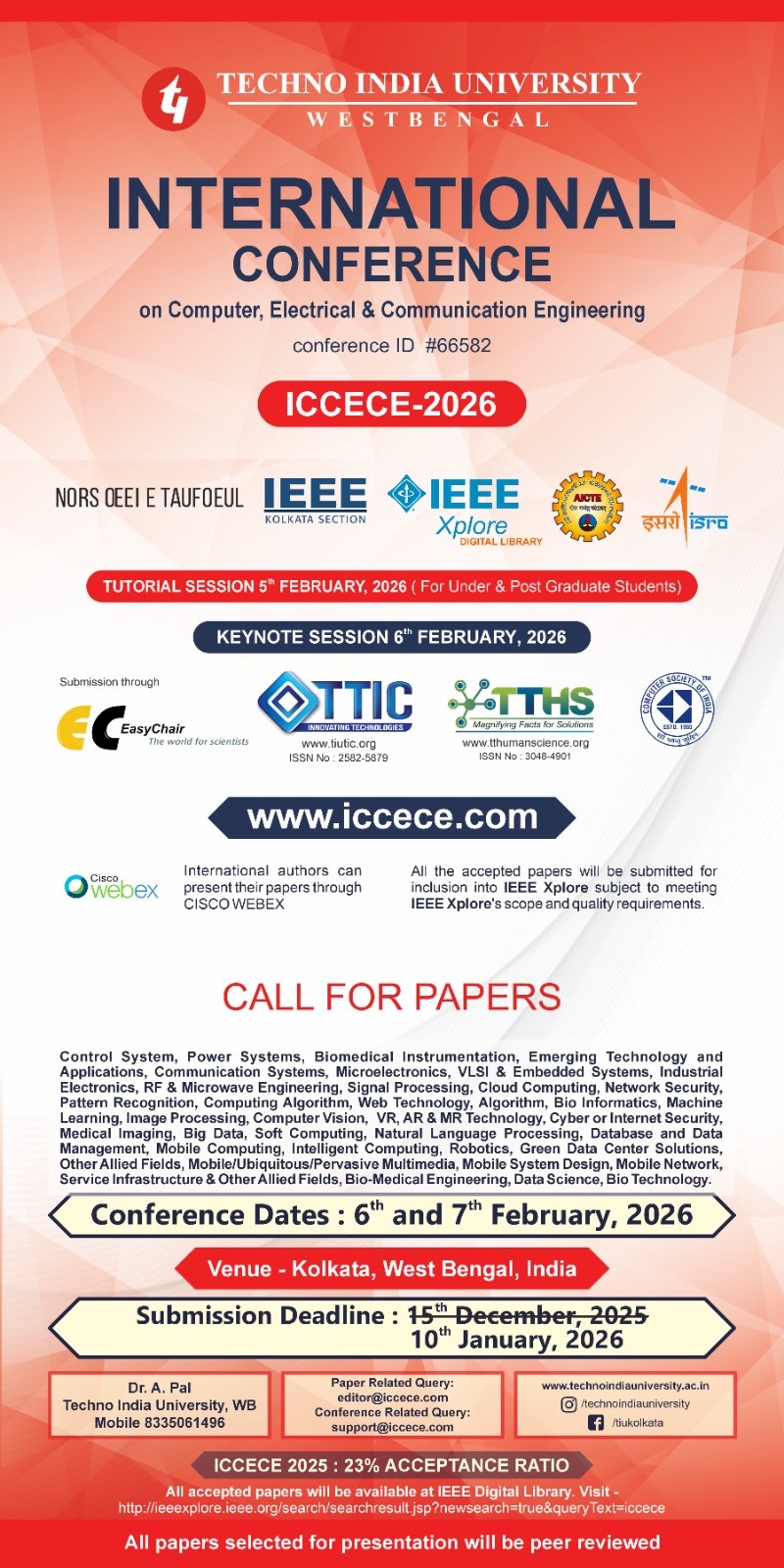 ICCECE is an international conference hosted by Techno India University, West Bengal covering research aspects in Computer, Electrical and Communication Engineering. The conference invites International Participants to present research papers through Skype, which is probably going to be a first time venture in India.
