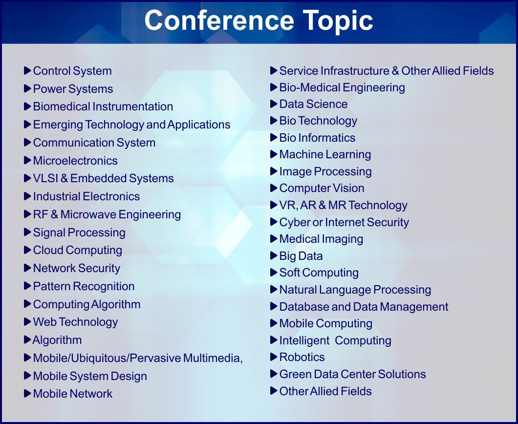 Papers should be submitted in English Medium, proof checked for grammatical and spelling errors, addressing one or various topics of the conference. All the papers should clearly mention the contribution towards technical/scientific areas, problems of the field as well as domains of applicability.