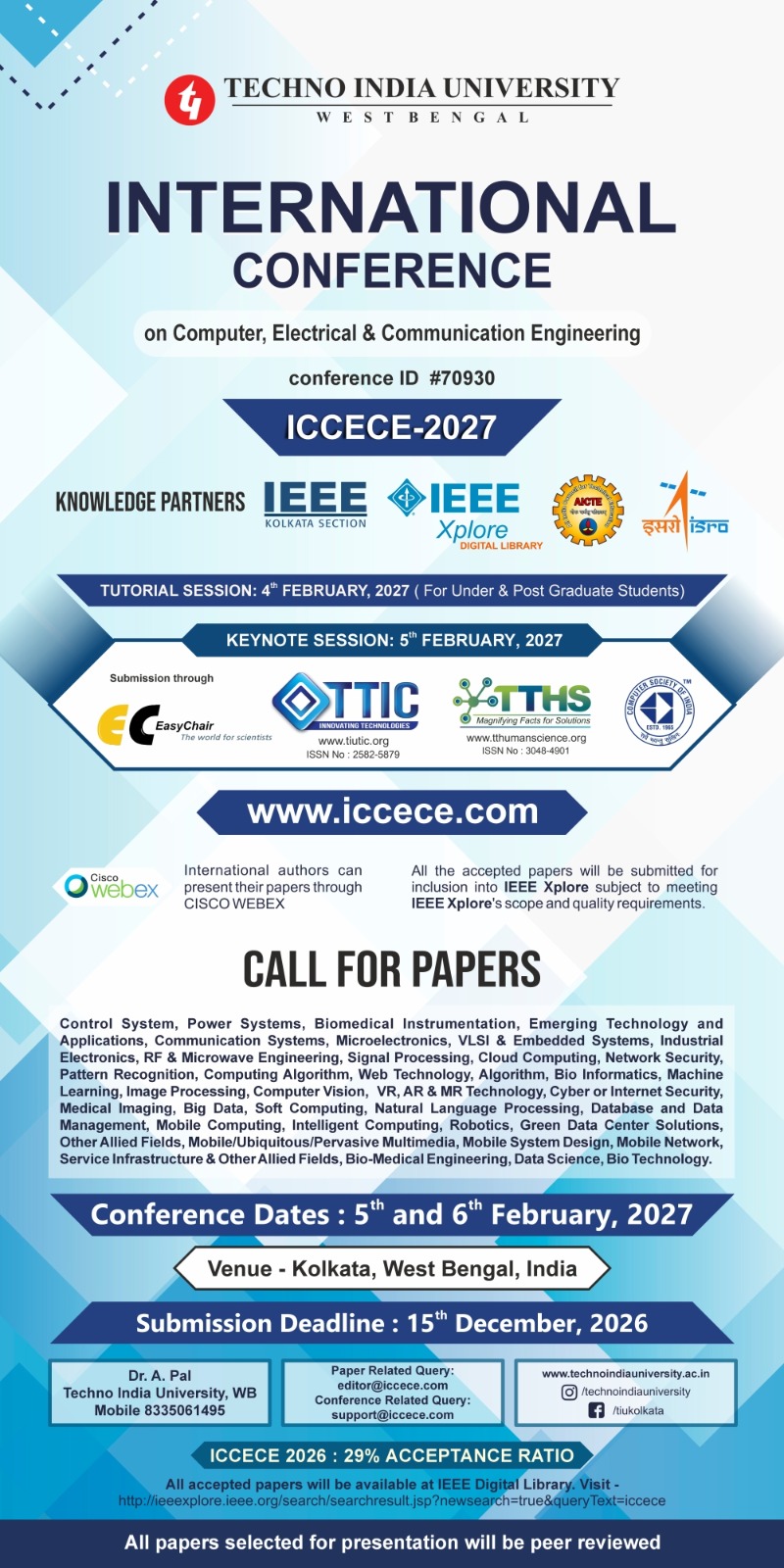 ICCECE is an international conference hosted by Techno India University, West Bengal covering research aspects in Computer, Electrical and Communication Engineering. The conference invites International Participants to present research papers through Skype, which is probably going to be a first time venture in India.